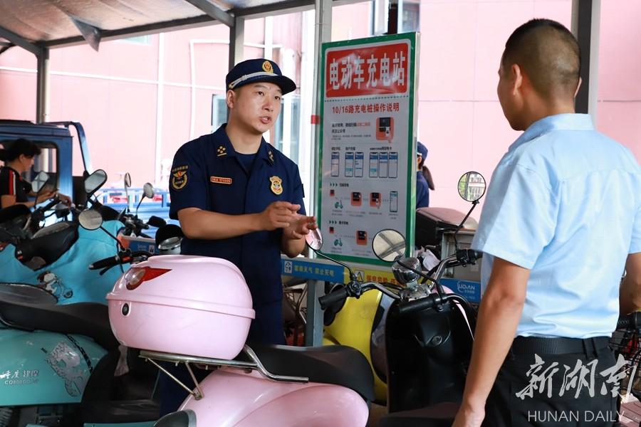 8月15日,防火监督员在住宅小区对电动自行车安全工作进行检查指导。当天,临澧县消防救援大队防火监督员对经营场所及物业小区的电动自行车开展火灾隐患排查行动,主要检查电动车充电线乱拉乱接、电动车违规停放、占用消防通道、灭火器配备不足等不符合安全要求的问题。陈自德 周菊 摄影报道