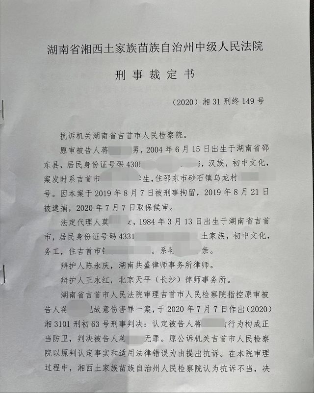2020年7月6日,吉首市法院作出一审判决,认为小蒋是在被他人殴打、生命受到严重威胁情况下,被迫进行自卫反击,属于正当防卫,判处无罪。