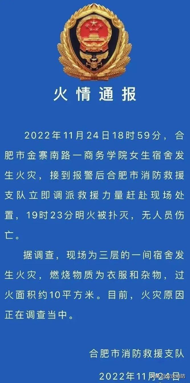 11月24日,安徽合肥金寨南路一商务学院女生宿舍发生火灾。据当地官方发布通告显示,起火建筑为三楼的一间宿舍,过火面积为10平方米。