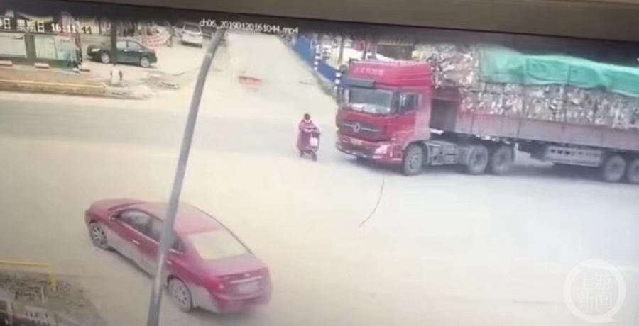 时长19秒的监控视频还原了事故发生经过:村道上,一名未戴头盔的女子骑着电动车由南往北行驶。当驶到十字路口中间时,电动车与一辆由西往东的半挂车车头右侧下方相撞。半挂车司机急忙向左打方向盘,滑行后停下。女子倒地不起。