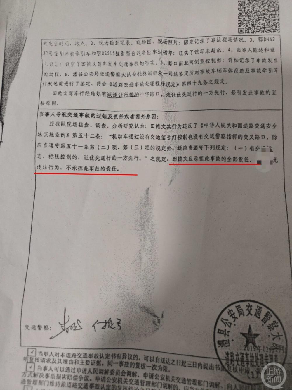 田德文介绍,他一边办理保险理赔,一边等候交警通知。2019年2月27日,澧县公安局交警大队下达事故认定书:田德文承担事故全部责任。他不服,并向常德市公安局交警支队提起复核。支队做出复核结论:大队的事故认定书事实基本清楚,证据基本充分,适用法律正确,程序合法,应予维持。