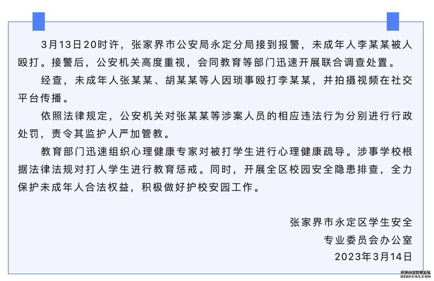 “微观永定”微信公众号消息,张家界市永定区学生安全专业委员会办公室3月14日发布关于网传未成年人被殴打事件处置情况的通报:3月13日20时许,张家界市公安局永定分局接到报警,未成年人李某某被人殴打。接警后,公安机关高度重视,会同教育等部门迅速开展联合调查处置。