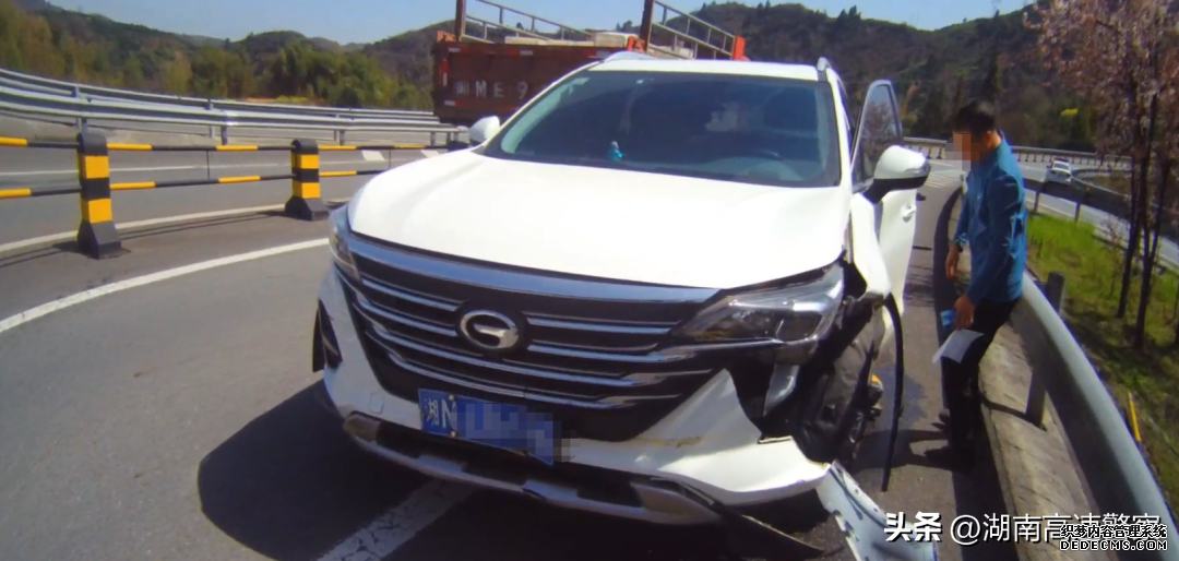 3月13日11时许,高警局怀化支队麻阳大队民警巡逻至包茂高速公路北往南2129km(匝道)时,发现一辆小车撞倒中央隔离墩停在路边,民警做好安全防护后立即进行处置。