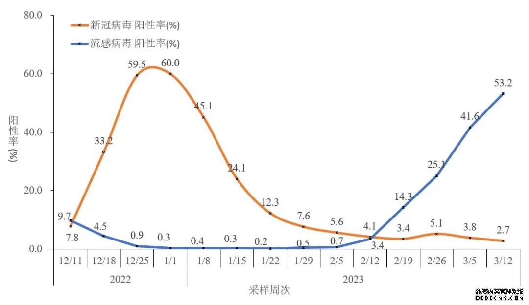 图源:中国疾病预防控制中心官网,全国哨点医院流感样病例新冠和流感病毒阳性率变化趋势(数据来源于402家哨点医院)