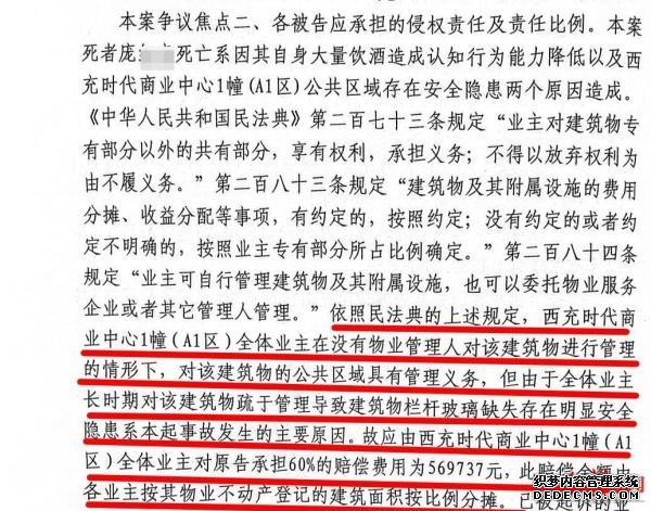 红星新闻记者获得的西充县人民法院一审判决内容显示,法院认定原告方因小庞死亡应得的赔偿共计94.9万元。法院审理认为,小庞死亡系因其自身大量饮酒造成认知行为能力降低,以及西充时代商业中心1幢(A1区)公共区域存在安全隐患两个原因造成。