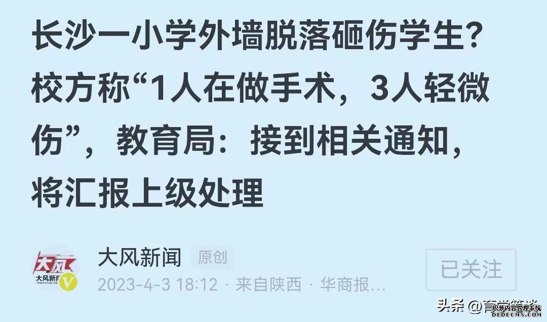 据媒体报道,湖南长沙长郡月亮岛某小学一教学楼外墙墙皮脱落,导致4名学生被砸,事发后一名学生伤势较重,进入医院做手术,另外3名学生受轻伤。