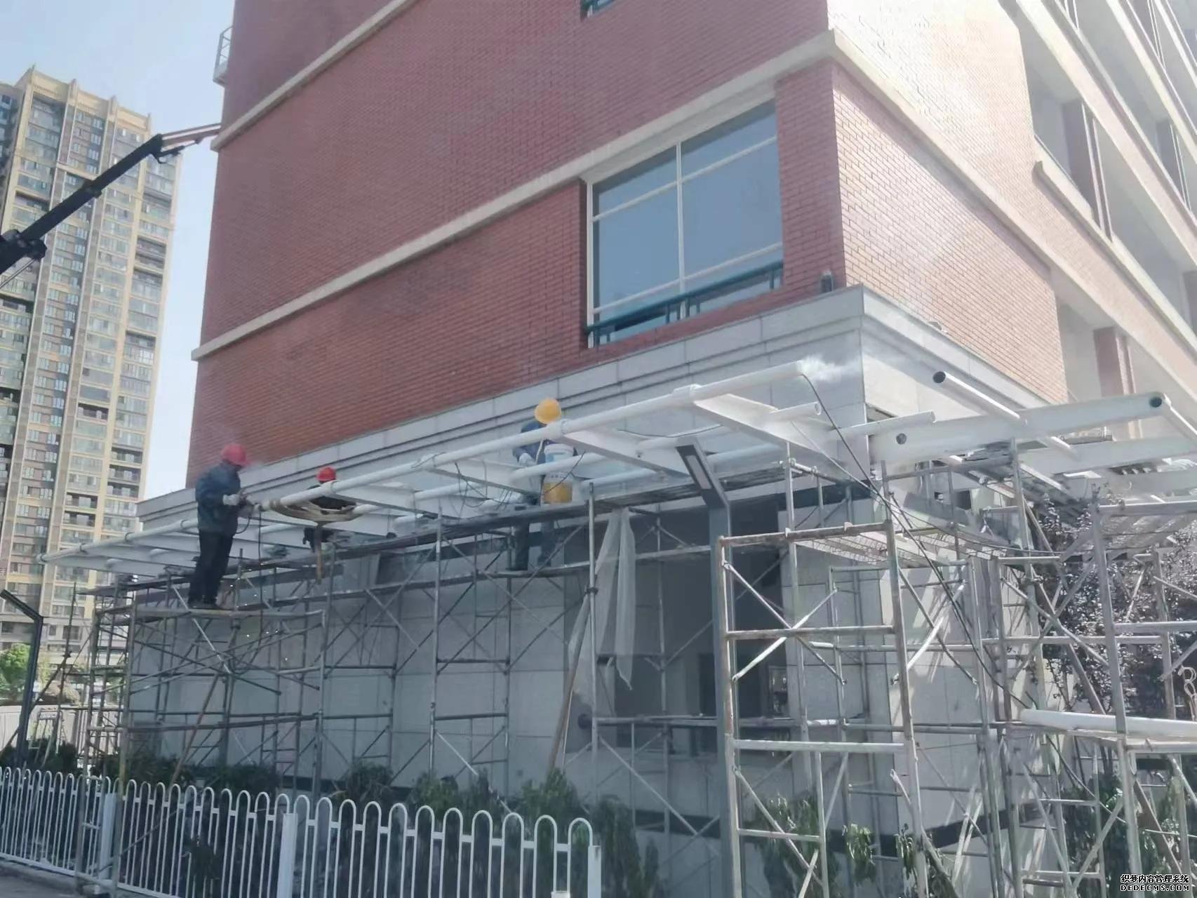 二、遮挡棚已经完成施工,基本清理完施工痕迹。施工工艺应该是植入化学锚栓,钢板,螺栓上钢构件,贴膜双层钢化玻璃。看现场,没有注意到地面加立柱。