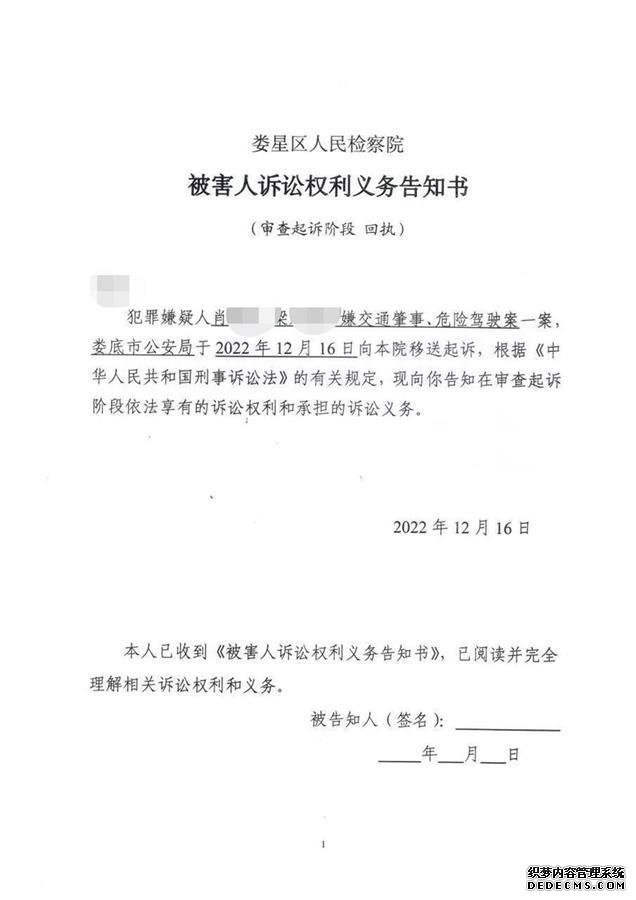 2022年12月16日,娄星区人民检察院给谢女士的家属发来的被害人诉讼权利义务告知书也写到,犯罪嫌疑人肖某某、梁某某涉嫌交通肇事、危险驾驶案一案,娄底市公安局于2022年12月16日向该院移送起诉。然而,在4月11日娄星区人民法院官方发布的庭审公开信息中,并未提到梁某某。参加庭审的谢女士家属告诉极目新闻记者,检方在法庭上明确表示,梁某某案件将另案审理。