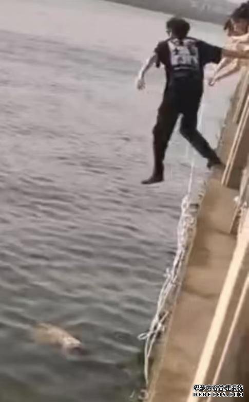 看上去比较平静的江水其实暗流涌动,贺益半托着对方奋力游着,但因水面距离平台有两三米高,他根本无法上岸。此时,岸上游客已从旁边拿来了两根救援绳索,不一会,又有游客抛下一个救生圈。