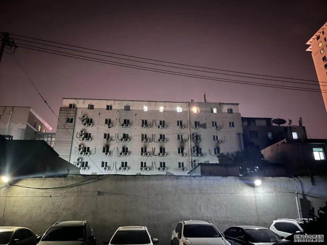 从正面看,东楼有7层,起火层在5层,窗口墙体有明显被火熏黑的痕迹;转到背面,东楼“变成”了8层,第8层和下面几层的外立面明显不同,从正面看不到的这一层,像后期加盖所为。