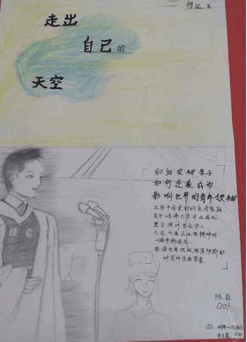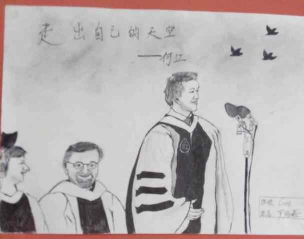 而画作的题材是画《走出自己的天空》一书的封面图,此书作者:何江,是湖南宁乡市农村的一位寒门学子,也是登上哈佛大学毕业典礼演讲台的首位华人。