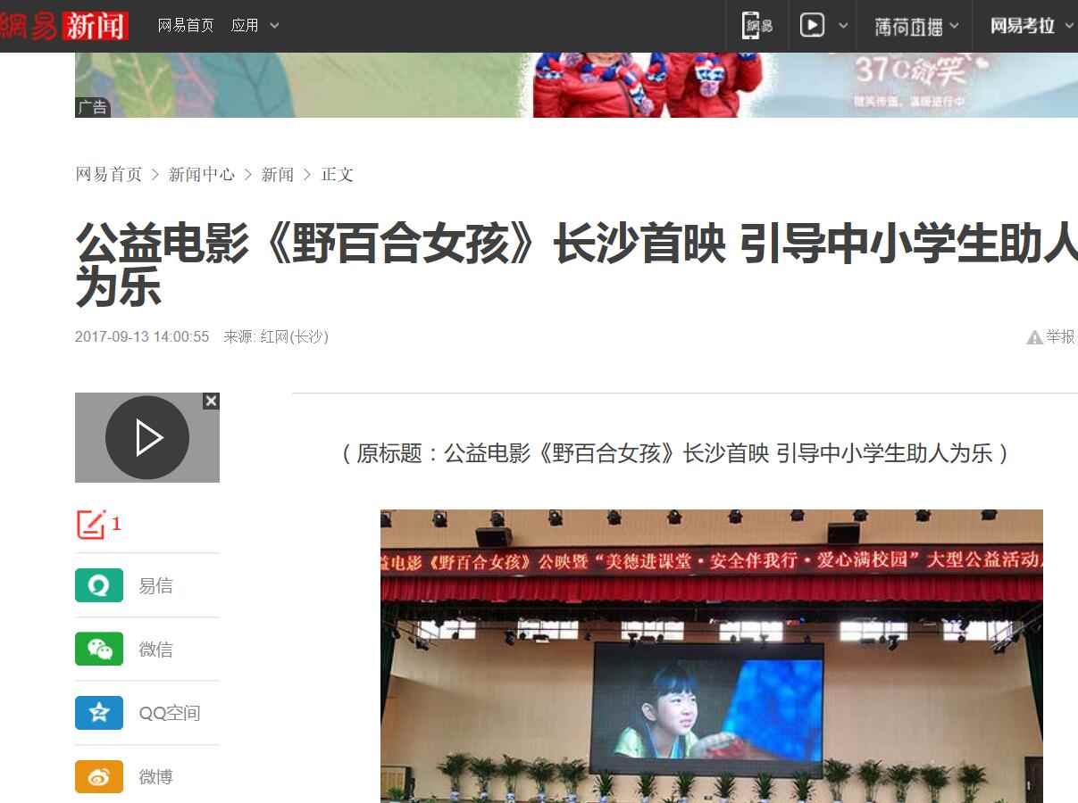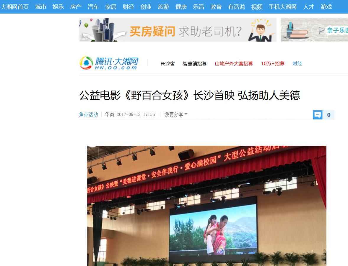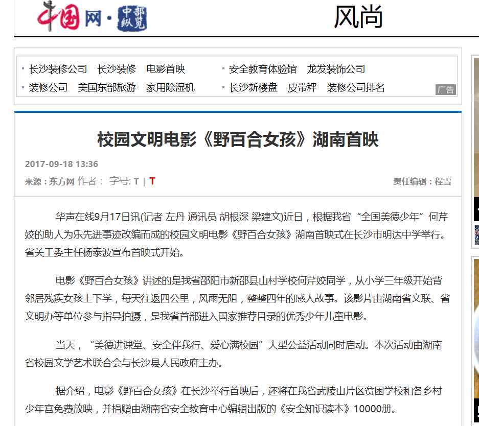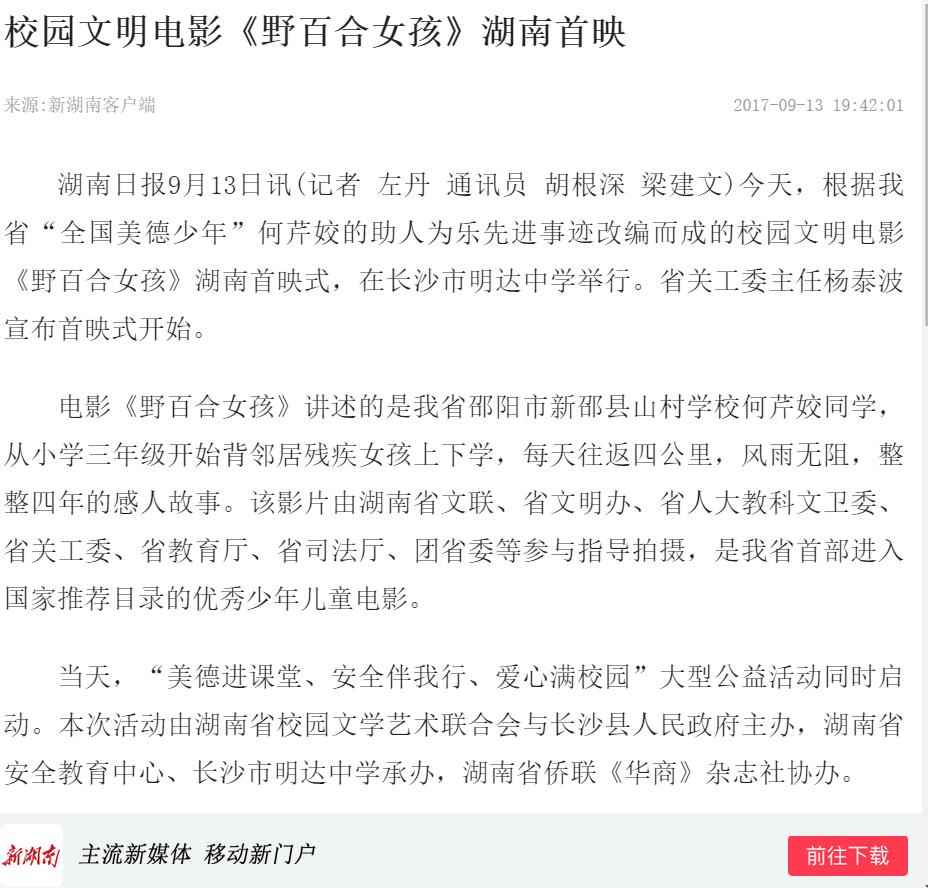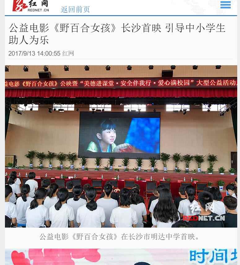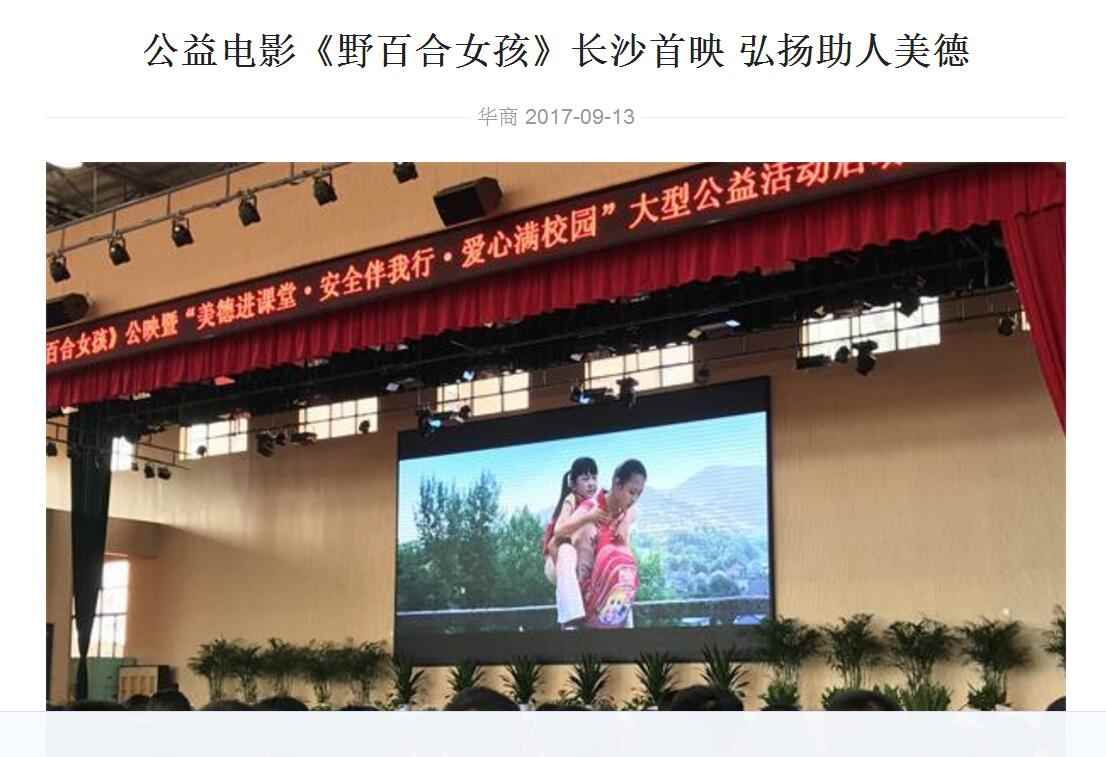 2017年9月13日,由湖南省安全教育中心承办,在湖南省长沙市明达中学举行的中华校园文明公益电影《野百合女孩》湖南首映式暨“美德进课堂·安全伴我行·爱心满校园”大型公益活动启动。国内众多媒体大篇报道。