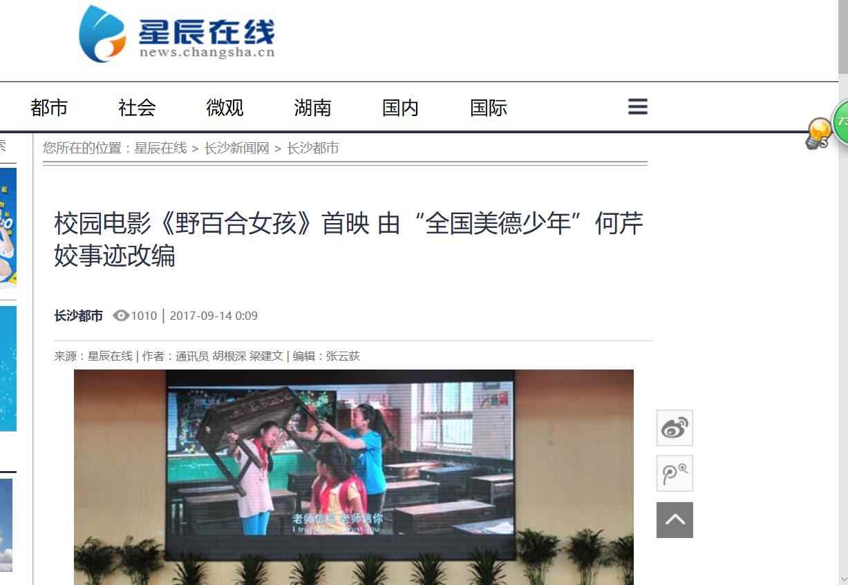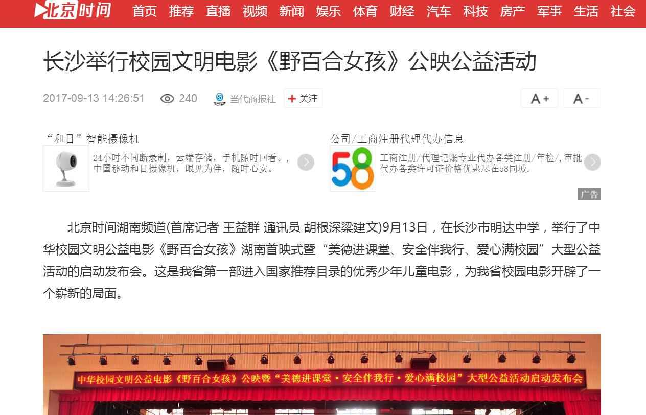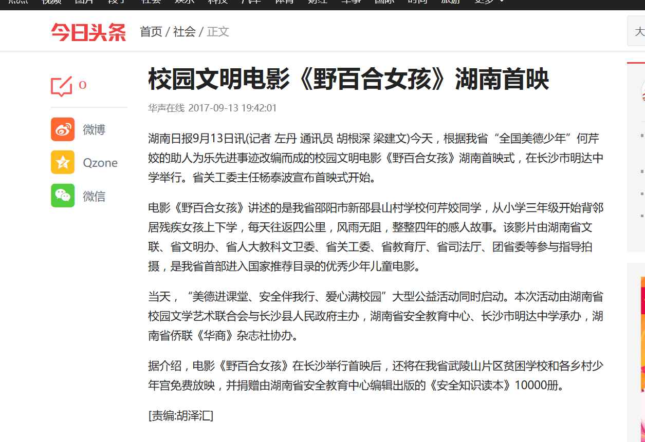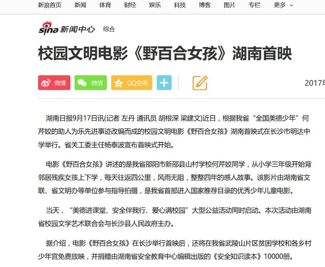2017年9月13日,由湖南省安全教育中心承办,在湖南省长沙市明达中学举行的中华校园文明公益电影《野百合女孩》湖南首映式暨“美德进课堂·安全伴我行·爱心满校园”大型公益活动启动。国内众多媒体大篇报道。