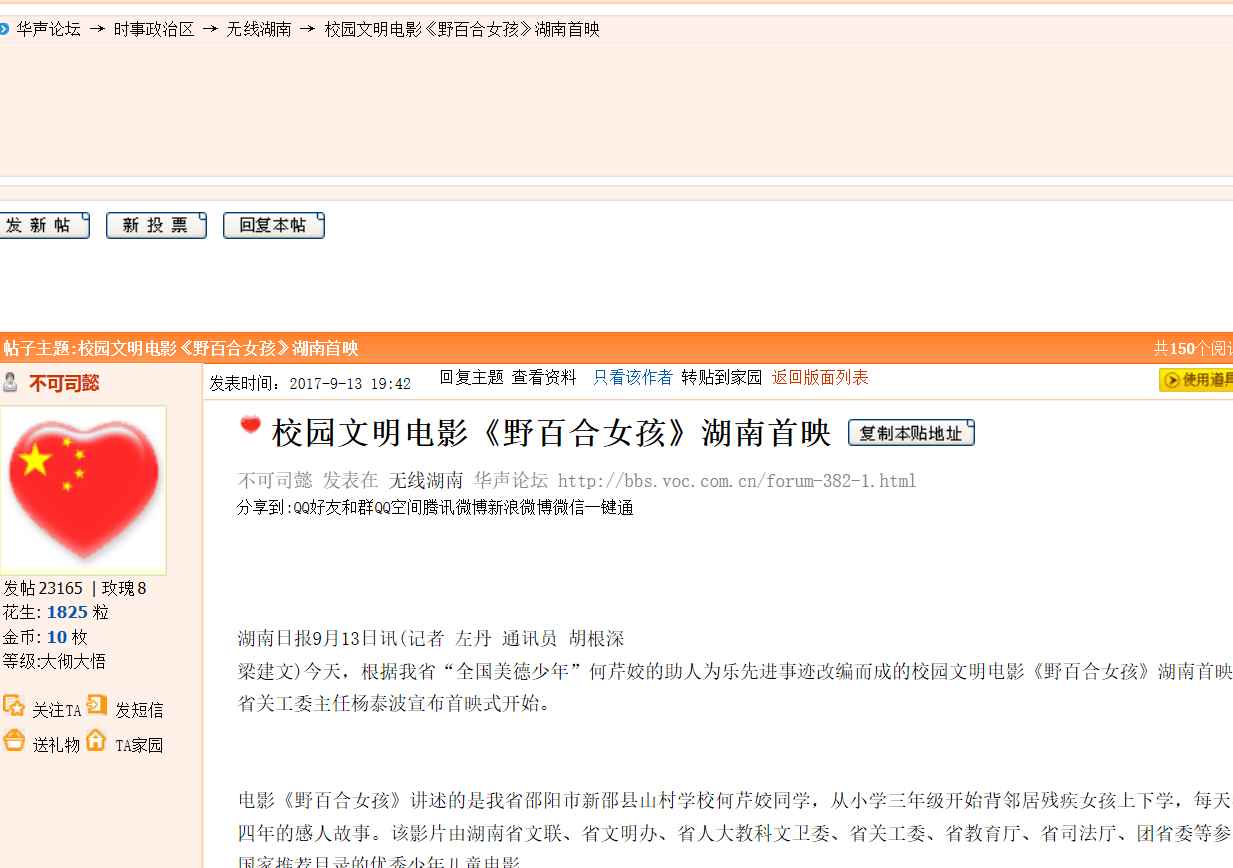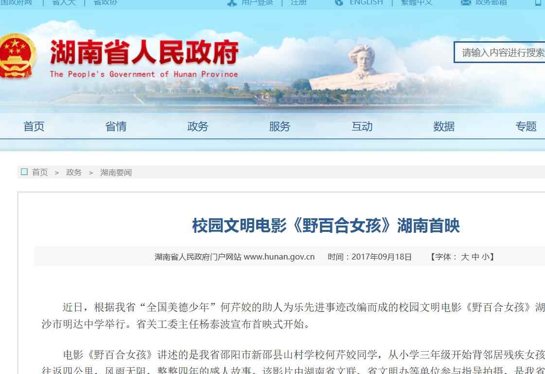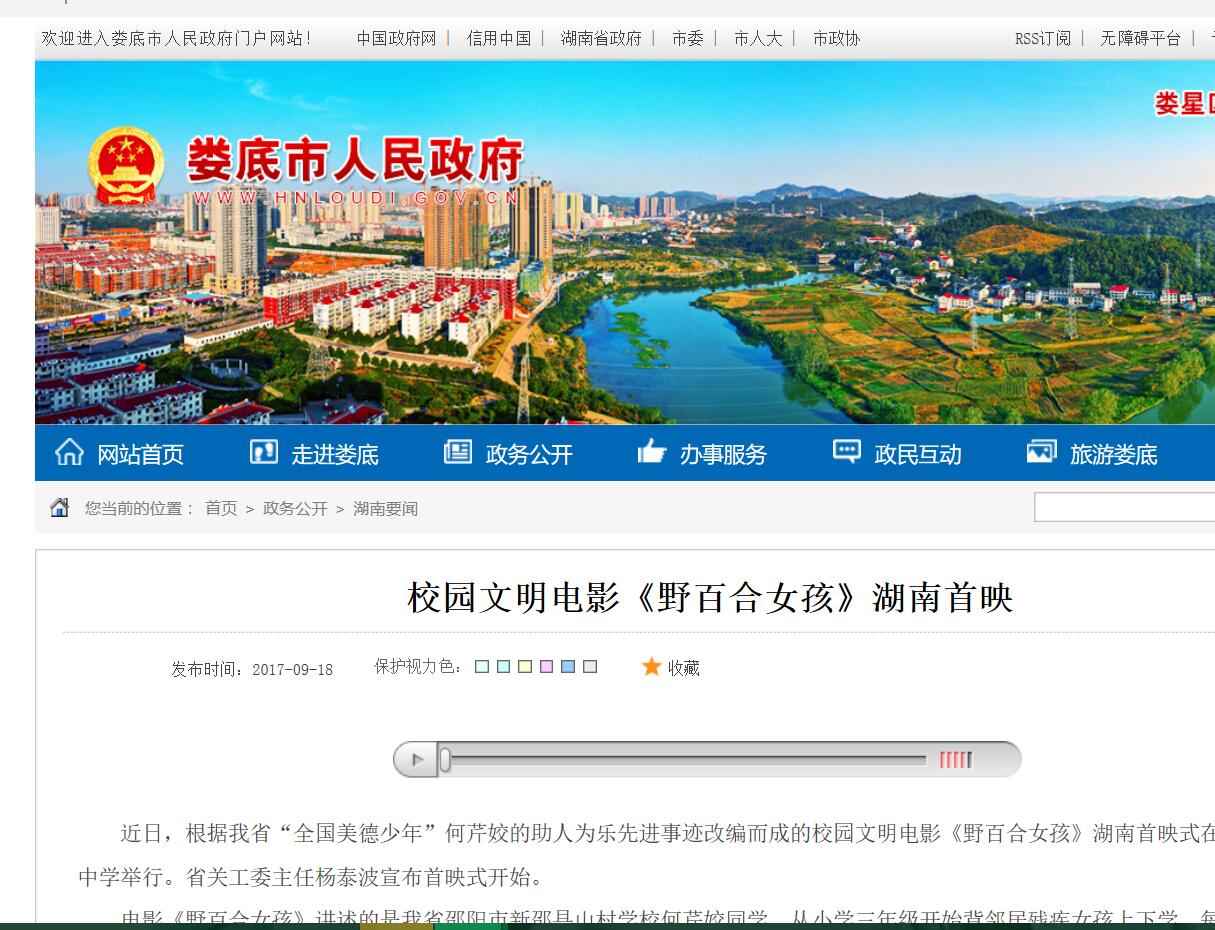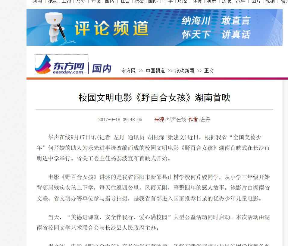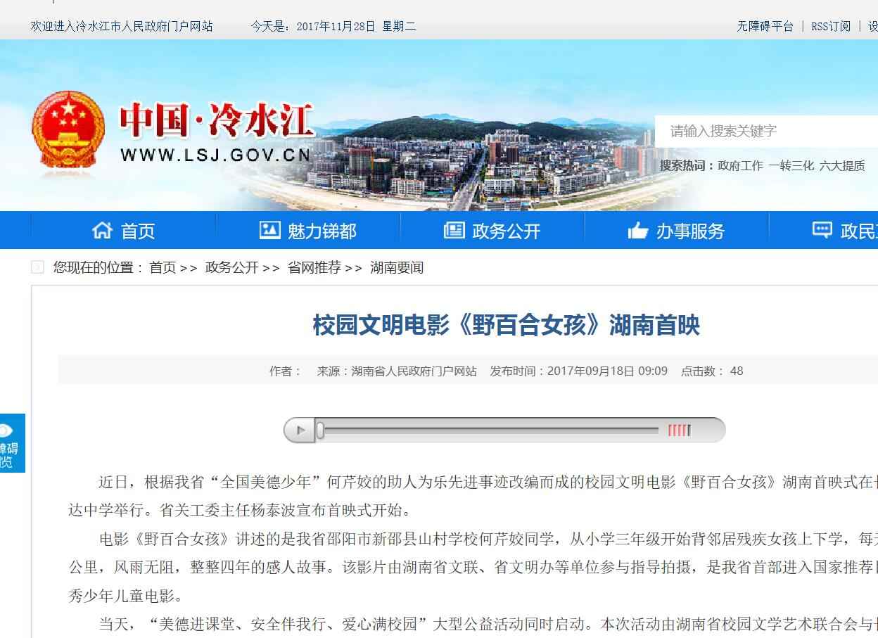 2017年9月13日,由湖南省安全教育中心承办,在湖南省长沙市明达中学举行的中华校园文明公益电影《野百合女孩》湖南首映式暨“美德进课堂·安全伴我行·爱心满校园”大型公益活动启动。国内众多媒体大篇报道。