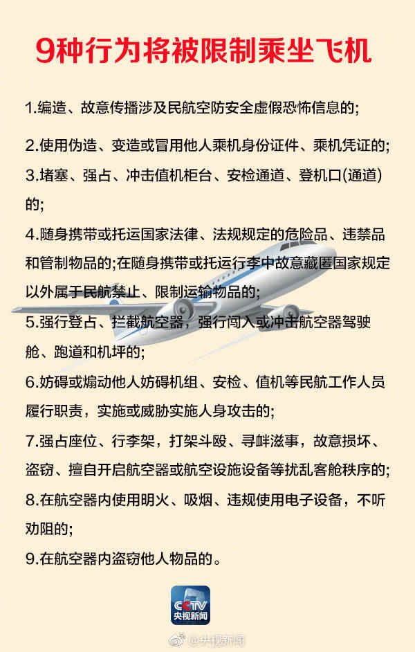 今天,央视记者在民航局获悉,国家发改委、民航局等部门联合发布相关意见规定,将对冲击值机柜台、登机口(通道)等9种行为的旅客采取限乘措施。民航局每月第一个工作日在官网和“信用中国”网站发布限乘名单、异议处理等信息。