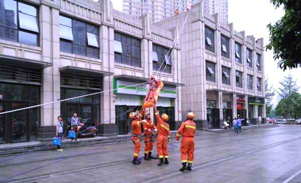 今日上午,消防官兵现场进行地震应急救援演练。