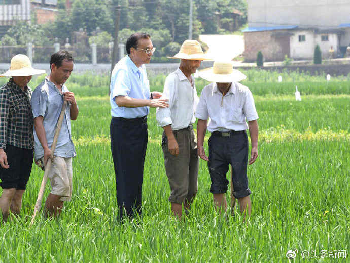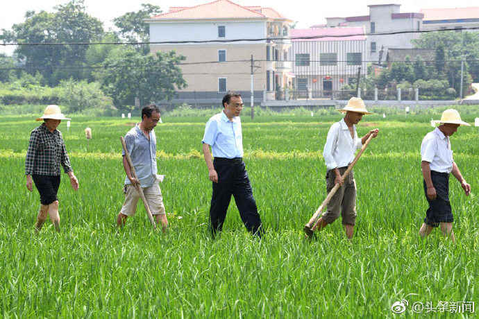 李克强总理6月11日来到湖南衡阳衡南县云集镇白水村考察农业生产情况。沿着狭窄泥泞的田埂,总理走进一处稻田,察看秧苗长势,并与正在田间耕作的农民一笔一笔算细账。从田头返回时,一位农民为方便总理在狭窄的田埂走路,下到水田,总理一把拉他上来说:咱们排队一起走!(中国政府网)