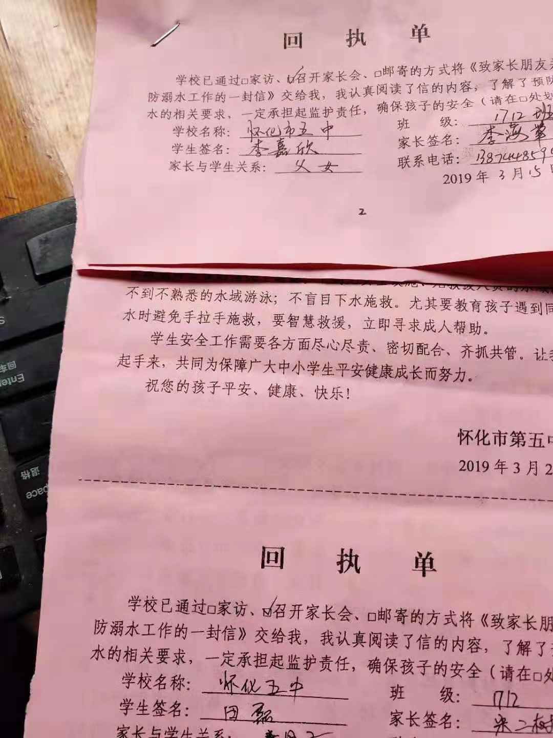 召开家长会,跟家长一起学习《关于安全工作致家长朋友的一封信》,注重9个方面的安全提示:游泳安全、交通安全、治安防范、防御自然灾害、饮食卫生、消防安全、网络安全、心理健康、毒品预防。会上家长集体宣誓《家长对学生安全教育的誓词》。《关于防溺水工作致家长朋友的一封信》家长知晓并填写回执单。让家长在思想上重视对孩子的防溺水警示教育,切实担负起监护责任。