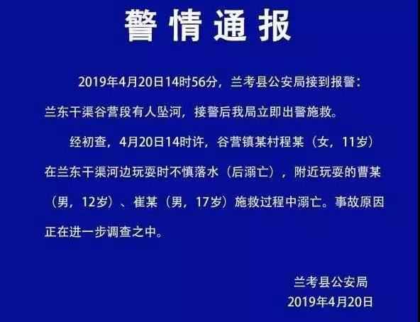 5. 4月20日,河南开封一女童(11岁)在河边玩耍时不慎落水(后溺亡),附近玩耍的两名未成年人(12岁、17岁)在施救过程中溺亡。