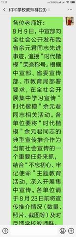 据悉,该校为确保学习的实效性,8月10日在教职工微信群、QQ群发布学习宣传余元君的通知及相关图片、链接等;在学校QQ群、班级QQ群发布余元君专题报道。全校教师28人,学生480人通过网络、电视等认真学习了余元君同志先进事迹。工会部门还及时对全体师生学习情况进行总结表扬。