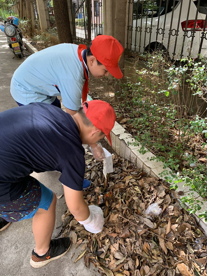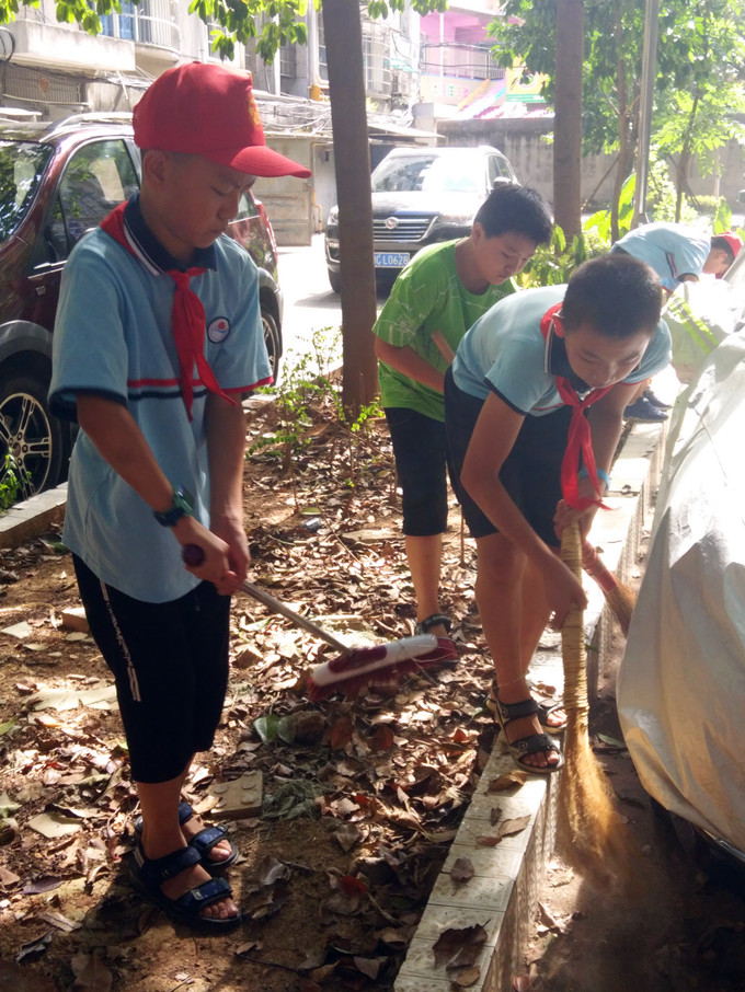 8月30日下午,骄阳似火,蝉声阵阵,1402班四十来位同学穿戴校服、红领巾及小红帽,来到岳塘区霞光西路梅塞尔住宅小区。陈老师进行了分工分组,瓦窑塘社区工作人员交代了一些注意事项及清扫方法。活动正式开始了,大家分工合作,共同努力,有的扫落叶,有的夹塑料袋,有的捡纸屑,有的装垃圾。花坛边,走廊上,过道里,绿化带,扫把、撮箕、夹子,桶子齐上阵。大家不走过场,不留死角,挥汗如雨,干劲十足,到处都是忙碌的身影,呈现一片热火朝天的景象。