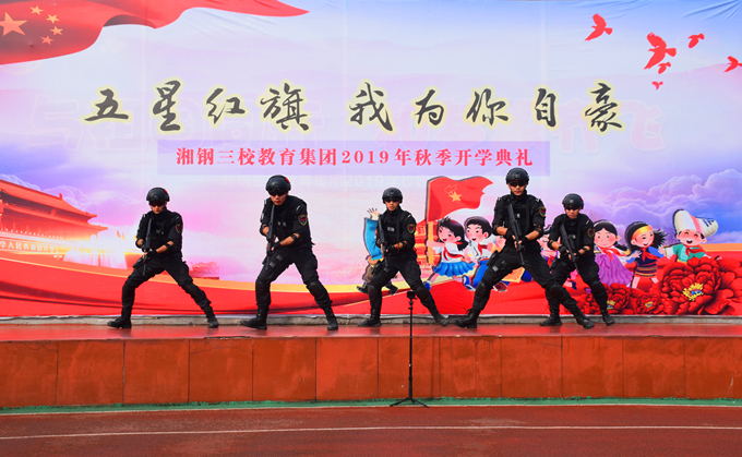 典礼上,1705中队的诗朗诵《中国少年》和1602中队的舞蹈《祖国妈妈我守护》激起了同学们的阵阵掌声。1802班更是邀请了在暑期社会实践活动中认识的湘潭市公安局红鹰特警突击队来到学校,向钢三学子展示了英勇帅气的特警队表演。