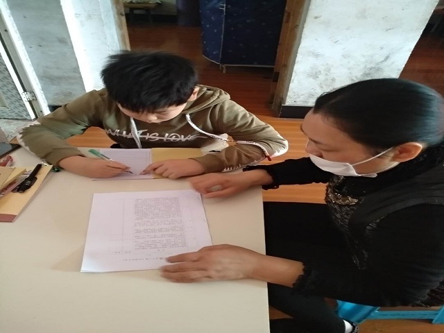二年级96班阿辉也是一名建档立卡学生,由于家庭的特殊情况,线上学习只能以电话沟通的方式进行,针对这一情况,本着“不放弃任何一个孩子”的原则,班主任王老师购买了一些学习用品,多次去他家指导孩子学习,王老师没有因为疫情和家庭的特殊情况而放弃自己的学生。