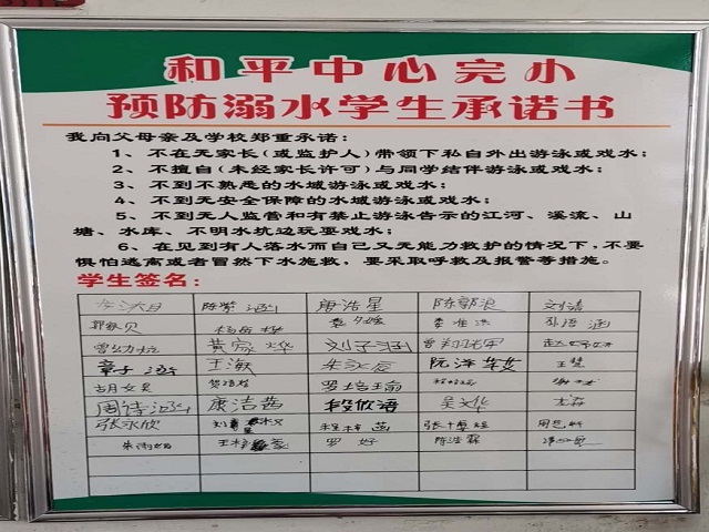 中午1:50,学校组织全体学生在各班教室举右手面向教室前方的国旗,在国旗下庄严的宣誓:“不私自下水游泳;不擅自与他人结伴游泳;不在无家长或教师带领的情况下游泳;不到无安全设施、无救援人员的水域游泳……”当天上午第一节课,该校安全部门负责人用鲜活的事例向全校师生阐述了溺水事故的危害性和严重后果,呼吁全体师生牢固树立“生命至上,安全第一”的思想,牢记并做到教育部提出的防溺水“六不”。下午第一节课,该校12个班的班主任组织自班学生在教室里开展了“珍爱生命,预防溺水”主题班队活动课。各班班主任就如何防溺水、预防溺水的措施、溺水时的自救方法及发现有人溺水时的救护方法等方面向孩子们进行了详细讲解;组织同学们观看了“孩子,请不要私自下水”安全警示片;进行了“珍爱生命,预防溺水”宣誓并签订防溺水承诺书等活动。