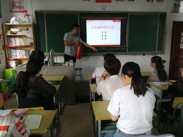 据悉,7月1日至7月8日,是该校区为期一周的教师安全素养培训周,学校狠抓安全工作,先从加强教师的安全素养开始。7月2日,学校邀请市消防安全员杨教官向全校教师进行了消防安全知识培训,给老师们讲述了干粉灭火器的使用、基本的消防安全知识以及应对火灾的具体措施,还现场演示了灭火器的操作方法,手把手地教老师使用灭火器。