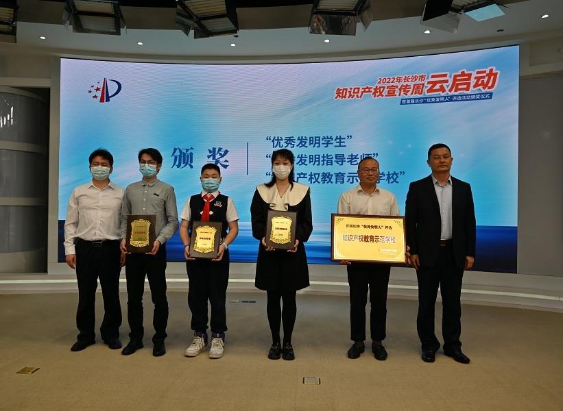 尹文博(左三)是首届长沙“优秀发明人”唯一获奖小学生。