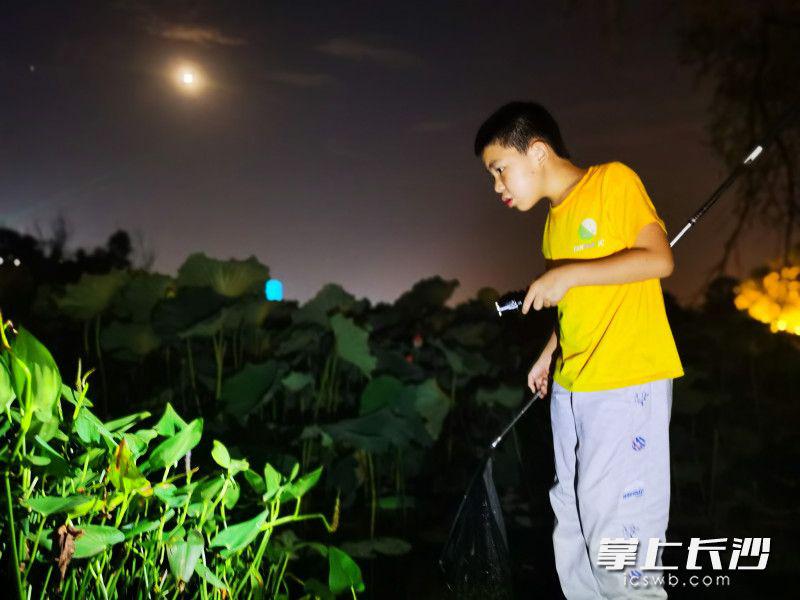 夜晚打着手电拿着捕虫网的小小生物家卿浩诚。均为受访者供图
