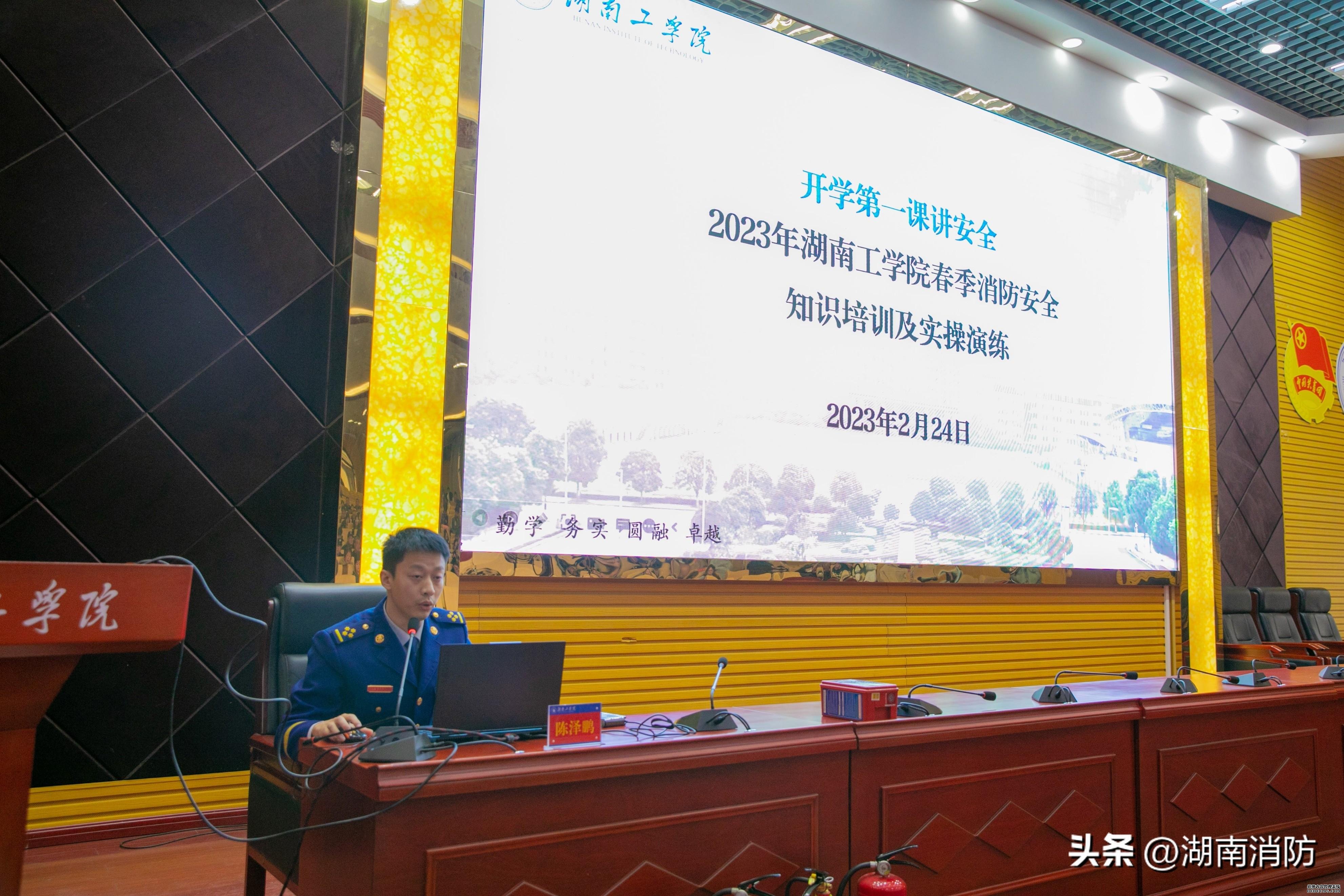 为进一步做好校园消防宣传教育工作,强化高校师生消防安全意识,2月24日,衡阳支队应邀来到湖南工学院,开展春季新学期“消防安全开学第一课”活动。学校食堂、经营门店负责人,学生宿舍管理员、物业服务人员及师生代表500余人参加培训。