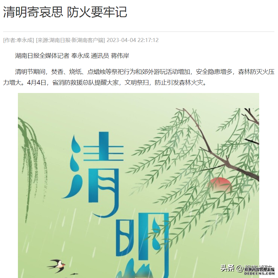 湖南消防在清明假期联合中央电视台、人民网、法治日报、中国应急管理报、中国消防杂志、湖南日报等中央、省市主流媒体推出视频科普、数据发布、祭祀防火、烈士纪念等多维度涉消信息超22篇,社会反响热烈。