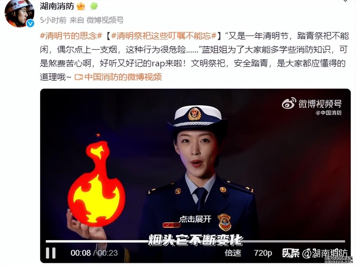 缅怀英烈的同时,也不忘传播清明消防安全知识。在湖南消防官方抖音、微博、微信等新媒体平台打造“应急科普说唱”“有奖答题互动”“文明祭祀倡议”等多种形式策划,不间断传播消防安全知识,视频全网播放量超730万,超190万网友参与互动。
