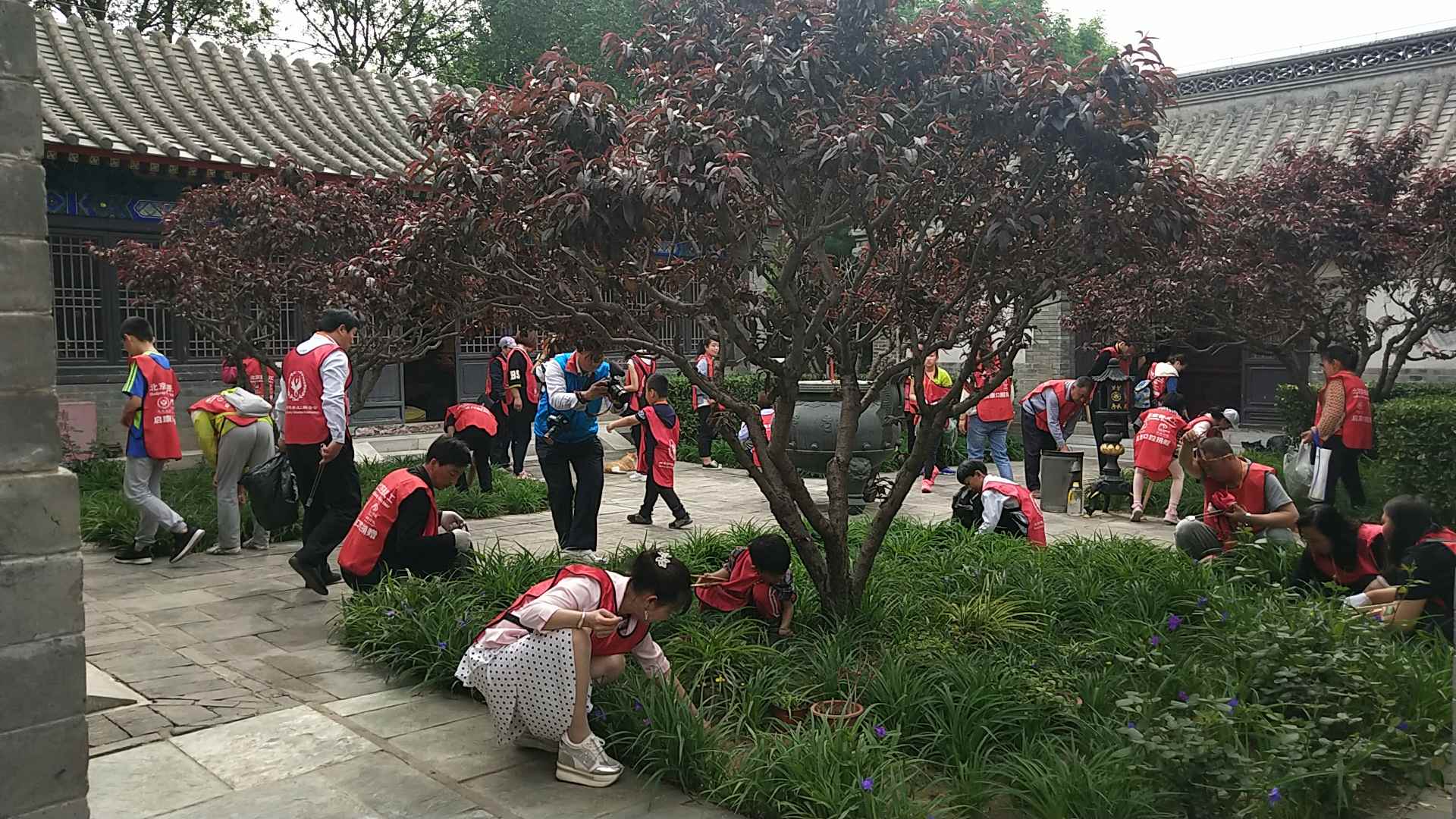 五月的天空变的湛蓝,似无暇的翡翠。洁白的白云一扫春日的阴霾,使天空变得的亮丽,像成群的绵羊,穿梭于云际,悠闲自在。北京市慈善义工联合会——金伶舞蹈慈善义工队五月之行的序幕拉开了,犹如润白的槐花把五月的故事一串一串地高挂在嫩绿的枝头。2019年5月3日早上8:30,我们来自四面八方在黄金伶队长的带领下开展志愿服务活动。慈善义工们聚集在南宫老爷庙,我们携手倡导“公益行动——文物保护、传递绿色希望”环保零垃圾的活动。