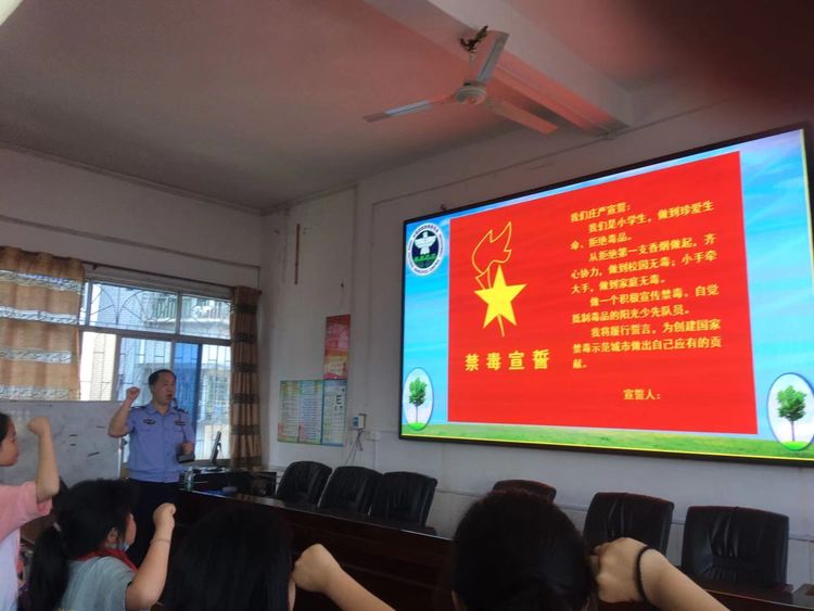 本次禁毒宣传教育活动首先在菱角山小学多媒体室举行“珍爱生命、远离毒品”小学生禁毒知识讲座,湖南省禁毒人民战争先进个人、冷水滩公安分局禁毒大队民警、永州市义工协会义工眭桂顺任主讲老师。眭桂顺以PPT为载体,从认识毒品、毒品的危害、导致吸毒的原因、如何抵制毒品、依法禁毒等五个方面,结合自己多年禁毒工作经验和冷水滩的具体案例,用通俗易懂的语言,向学生们介绍了毒品毁灭自己、祸及家庭、危害社会的严重恶果,学生们听得认真,将禁毒知识写在纸上,铭记心中。表示一定要珍爱生命、远离毒品。讲座的最后,学生们面对着鲜红的小先队队旗举起右手,进行了庄严禁毒宣誓。
