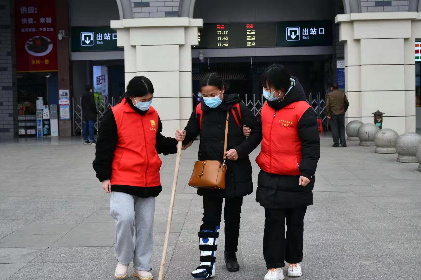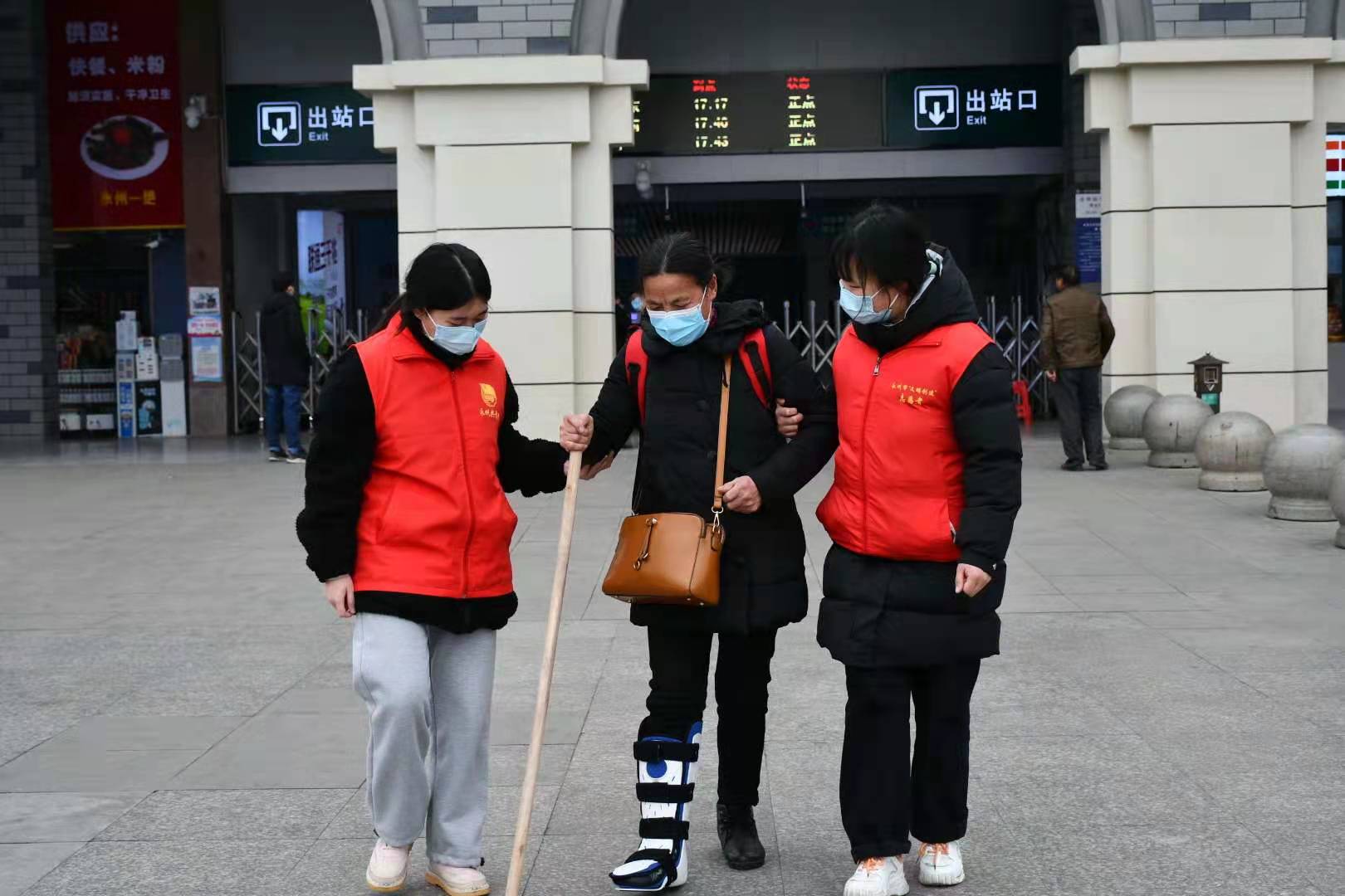 1月30日,下午,一位腿受伤打石膏的阿姨独自一人坐火车从衡阳返回永州,在出站口参加“情满旅途 暖冬行动”的两位志愿者见状立马上前搀扶护送她到公交停车场,阿姨看到志愿者热情帮助非常高兴,连连夸奖并特意拿手机跟志愿者拍照合影发朋友圈,在公交车上开心的挥手跟志愿者道别。
