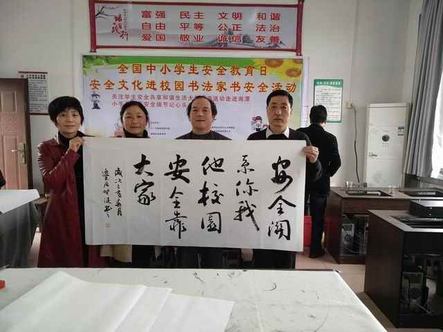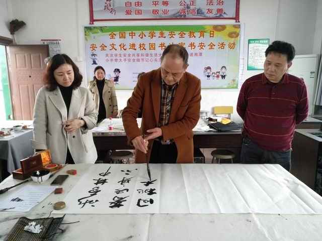 在全国第24个中小学生安全教育日到来之际,3月27日,八一书画院湖南分院书法家和湖南安全教育网专家走进湘潭市岳塘区湘钢三校教育集团和平校区开展“关注学生安全共享和谐生活大型公益活动”“小手牵大手安全细节记心头主题活动”,八一书画院湖南分院书法家屈德馨、彭和平、蒋忠保等著名书法家和湘潭市莲城书画家协会部分成员为该校师生书安全警示语。