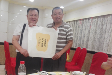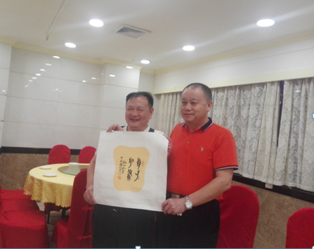 杨老师给广东永州商会法人代表、执行会长秦保国赠送著名国礼书法家张国权女书作品。
