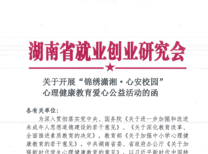 “锦绣潇湘·心安校园”是根据教育部办公厅《关于加强学生心理健康管理工作的通知》(教思政厅函〔2021〕10号)和中共湖南省委办公厅、湖南省人民政府办公厅《关于加强新时代学生心理健康教育的意见》(湘办发[2020]12号)文件的要求,在全省中小学校开展的公益活动,主要以捐赠的形式捐赠心理健康教育包,内含心智普测,心理培训、咨询,《中小学生安全预防与自救手册》捐赠。