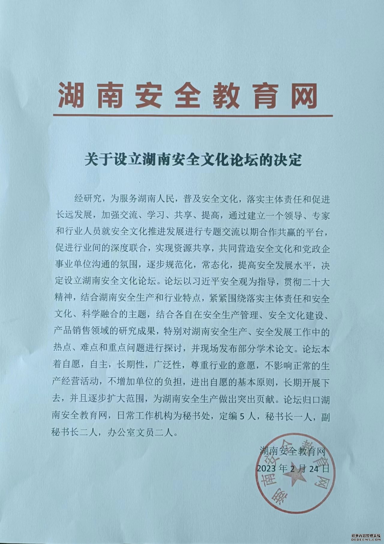 2023年2月24日,湖南安全教育网发布关于成立湖南安全文化论坛的决定,为服务湖南人民,普及安全文化,落实企业主体责任和促进企业长远发展,加强交流学习、共享、提高,通过建立一个领导、专家和行业人员就安全文化推进行业发展进行专题交流以期合作共赢的平台,促进行业间的深度联合,实现资源共享,共同营造安全文化和行业沟通的氛围,逐步规范化,常态化,提高安全发展水平,决定设立湖南安全文化论坛。