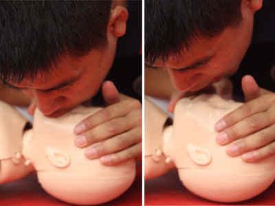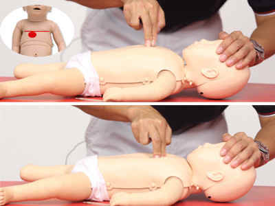 操作方法:胸部按压时一手扶住婴儿的头部,另外一手的食指和中指两个并拢在婴儿的两乳连线中点下方进行按压,按压深度在在婴儿胸壁厚度的三分之一左右,或者是四厘米左右,按压的频率是每分钟至少一百次。按30下后进行人工呼吸,往宝宝嘴里吹入空气后再行按压,然后再次吹气。