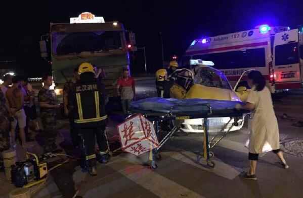 楚天都市报7月22日讯(记者刘闪)7月22日凌晨2时30分,江岸区建设大道和二七路交叉路口,发生一起严重车祸,一辆渣土车撞上一辆夜班的士,的哥和乘客两人被困,过路群众纷纷报警,公安交警、消防和救护车赶来后,紧急将两人救出送医救治。