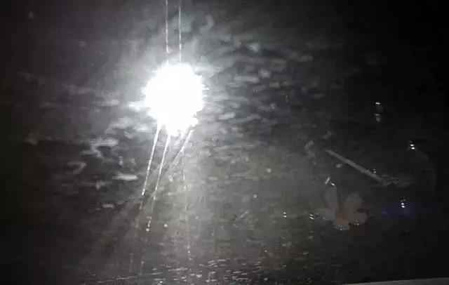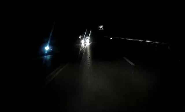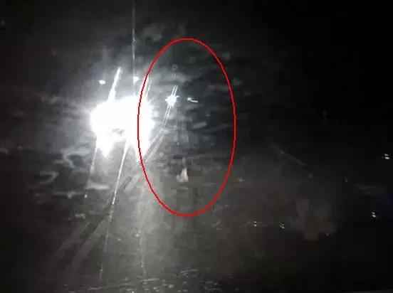 然而突然出现一辆货车,开着远光灯,影响到面包车驾驶员的视线。
