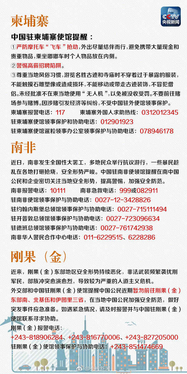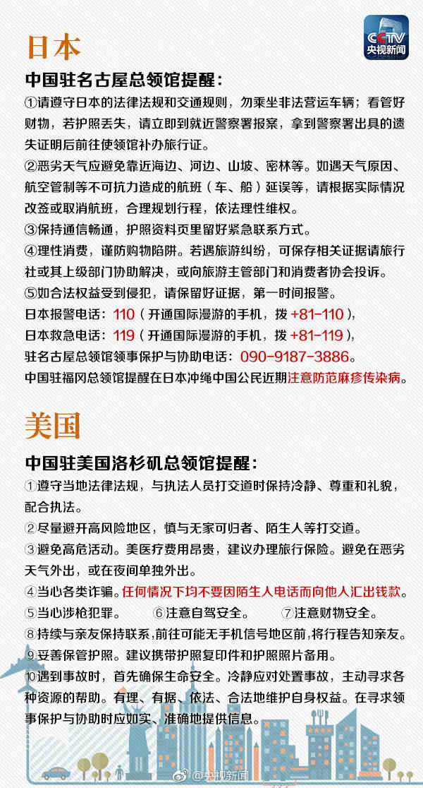 近期进入旅行高峰,外交部和我国驻外使领馆连续发布安全提醒,提醒赴外中国公民注意出行安全。提醒大家,如在国外遇到突发或紧急状况,尽快联系当地警方、中国使领馆,还可联系外交部全球领保与服务应急呼叫中心:+86-10-12308。
