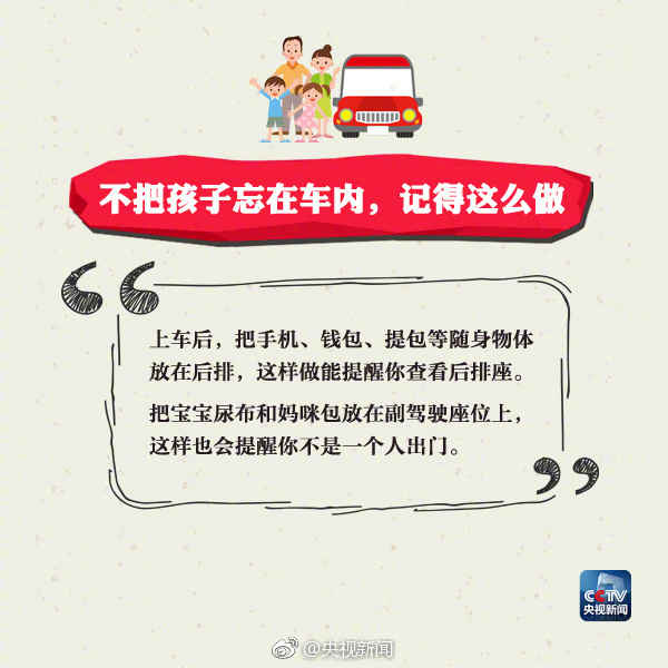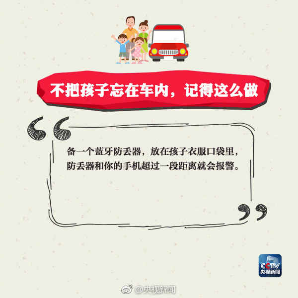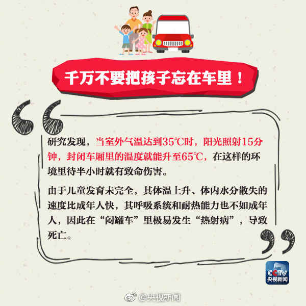 近日,湖南湘潭一孩子被父母遗忘车内5小时,等家人发现异常,孩子已经在车内死亡。夏季气温高,孩子被锁车内,短时间也可能有生命危险。提醒:家长一定多留心,切勿将孩子单独留在封闭车内!