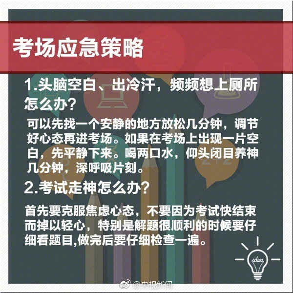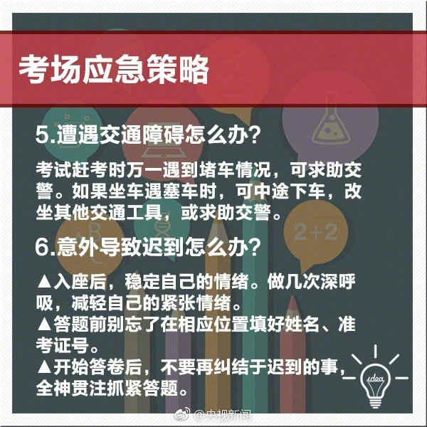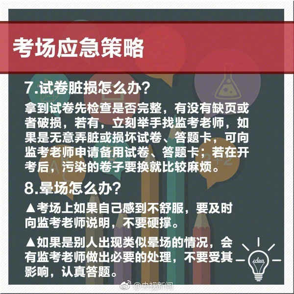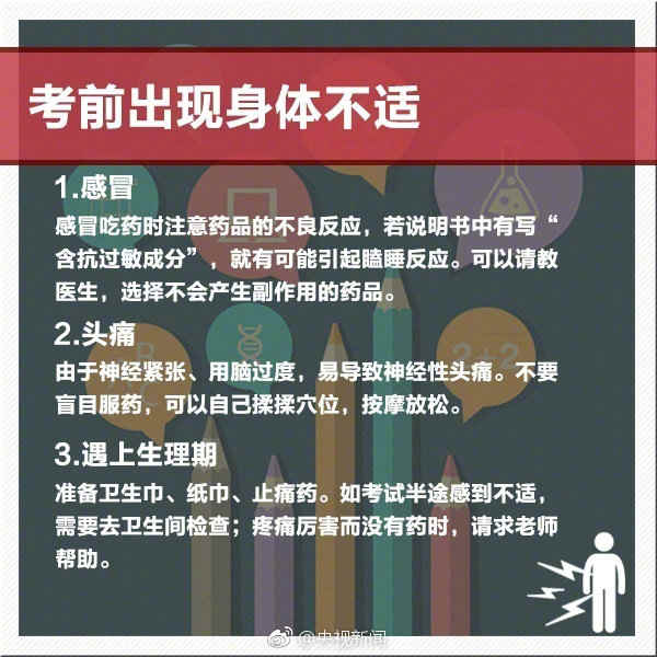本周末,2019年全国硕士研究生招生考试初试将至。身体不适、情绪紧张、晕场、临场发挥失常……考试时遇到这些情况怎么办?别急,看图,告诉你考前注意事项及突发情况应对方法。