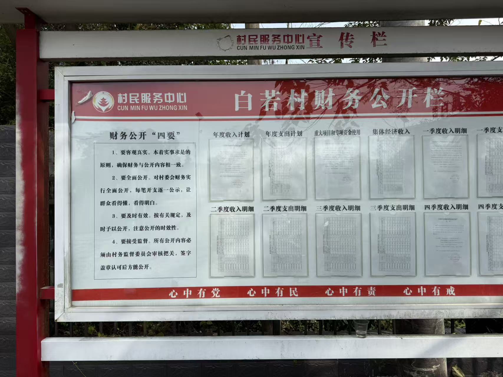 财务公开栏的“四要”原则——客观真实、全面公开、及时有效、接受监督,像一把透明的尺子,丈量着村集体的每一笔收支。一季度、二季度……那些明细表格里的数字,是村民们看得见的“明白账”。