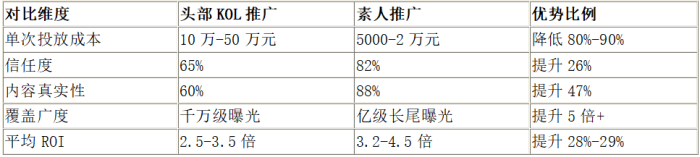 与传统头部KOL营销相比,素人推广具备明显的成本效益优势: