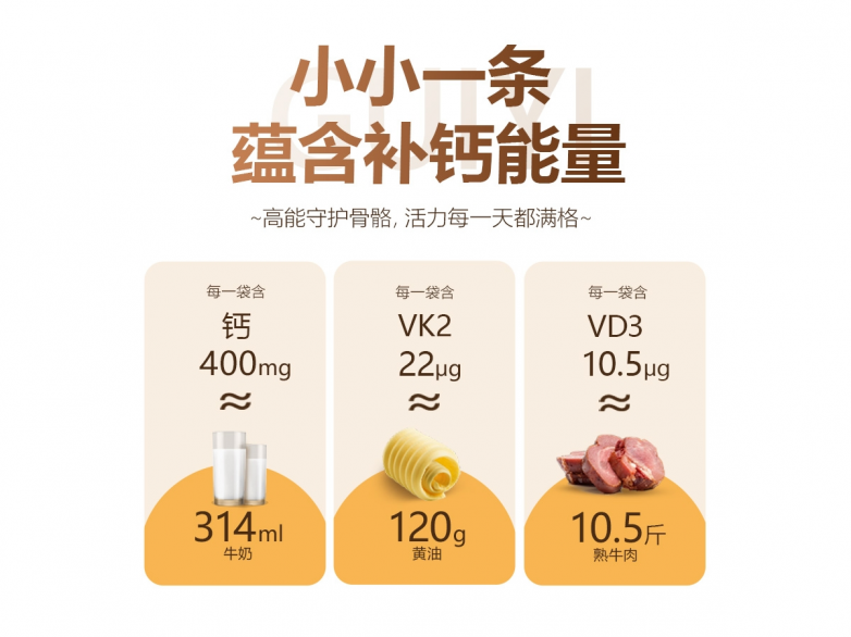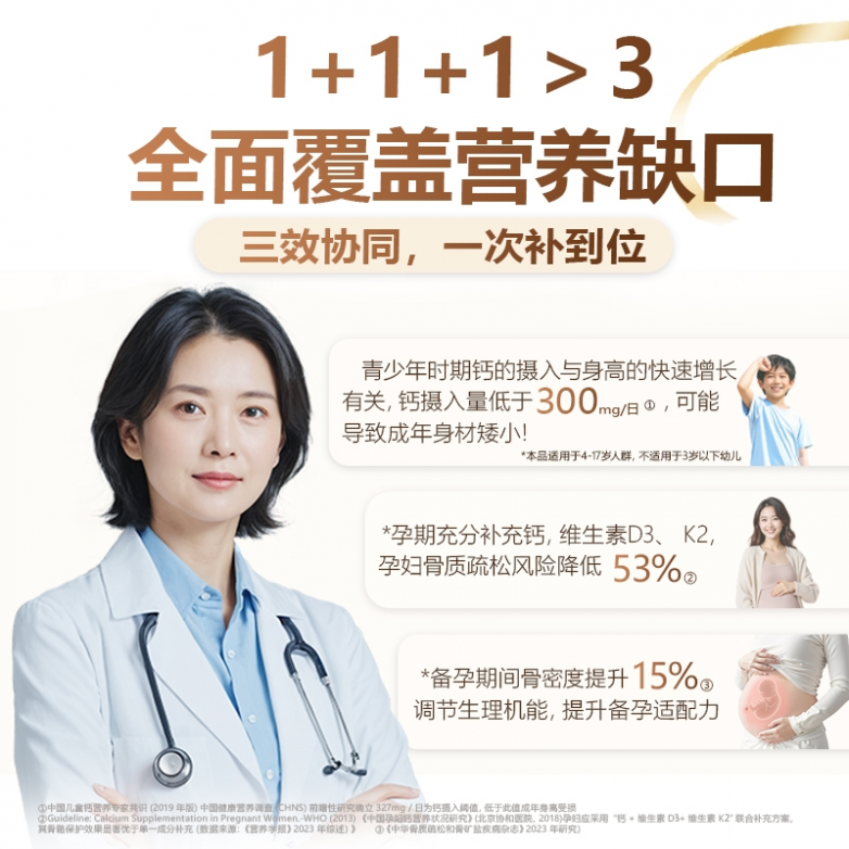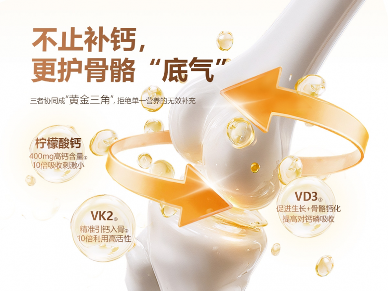 单一的钙质补充,只能做到基础的营养补给,很难满足儿童、孕妇、哺乳期女性的全方位养护需求。4.0微米柠檬酸钙温和补够钙,为骨骼发育筑牢基础;专利维生素D3打通吸收通道,助力钙质高效转运,避免营养浪费;专利维生素K2(MK-7)引导钙质定向沉积,让补进去的钙真正用到骨骼上,同时抑制破骨细胞生成,强化骨骼养护效果,三者相互配合,形成“补钙-促吸-固钙”的完整闭环,比单一成分产品更全面、更贴合多人群需求,从根源上呵护骨骼健康,助力孩子成长、守护孕哺期女性健康。